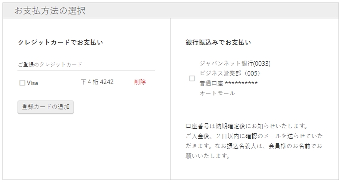 お支払い方法は、クレジットカード(VISA、MasterCard、JCB、AMERICAN EXPRESS)、銀行振込がご利用いただけます。